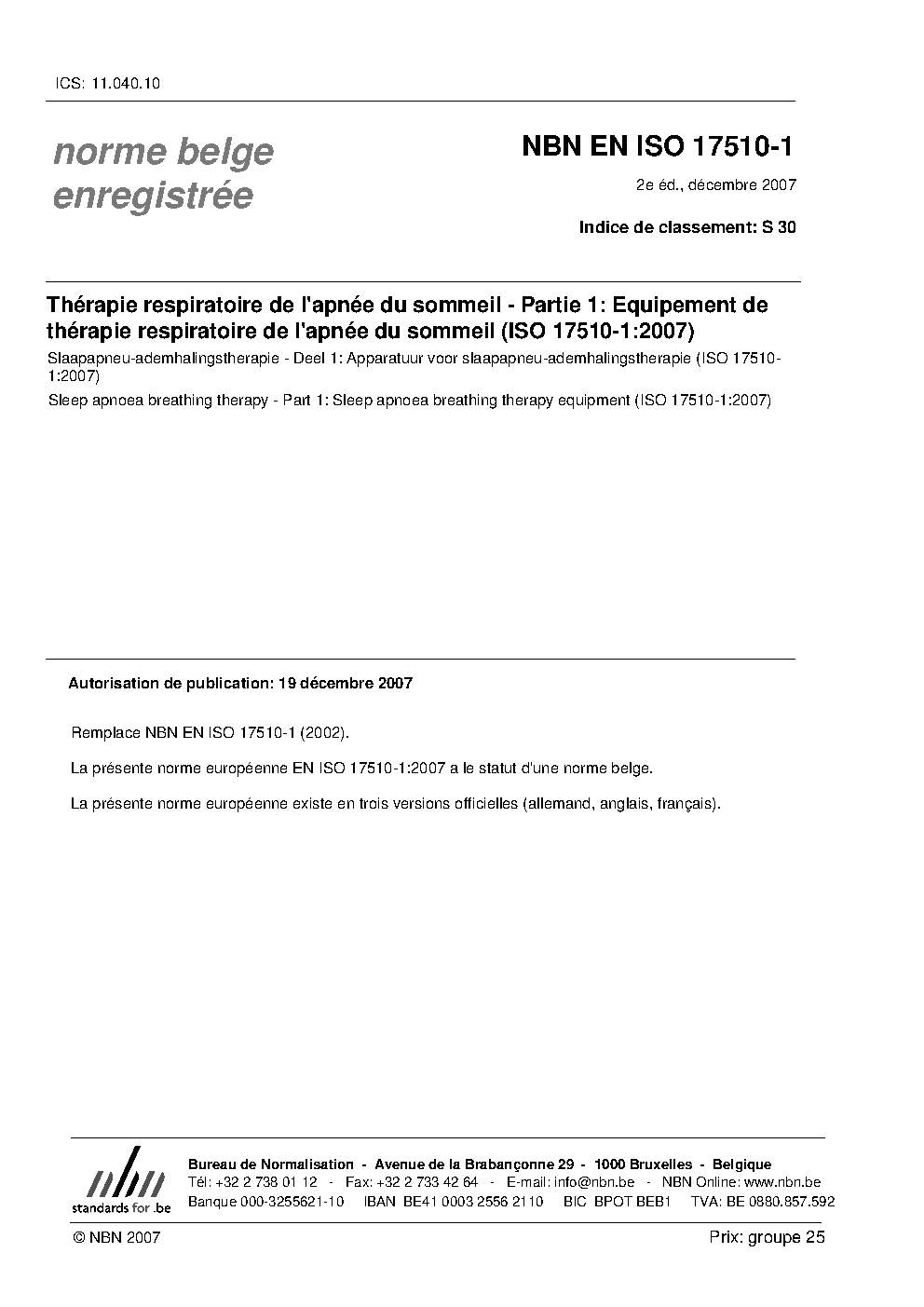 ISO 17510-1:2007 specifies requirements for equipment intended for sleep apnoea breathing therapy for domiciliary use, ships, aircraft and other transport vehicles and for use in healthcare institutions.
