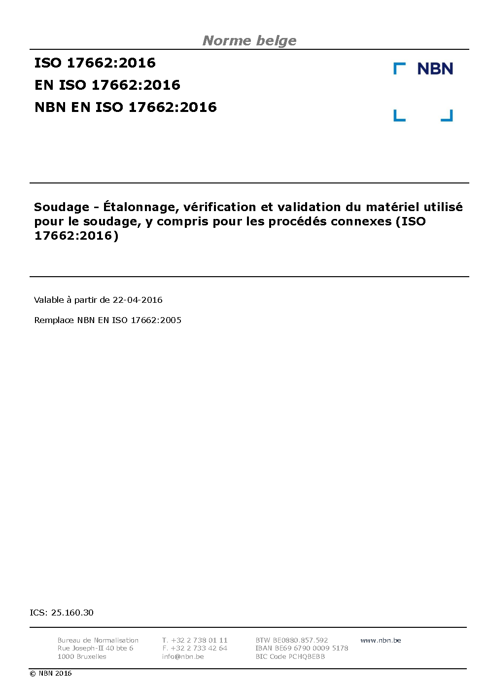 Welding - Calibration, verification and validation of equipment used for welding, including ancillary activities (ISO 17662:2016)