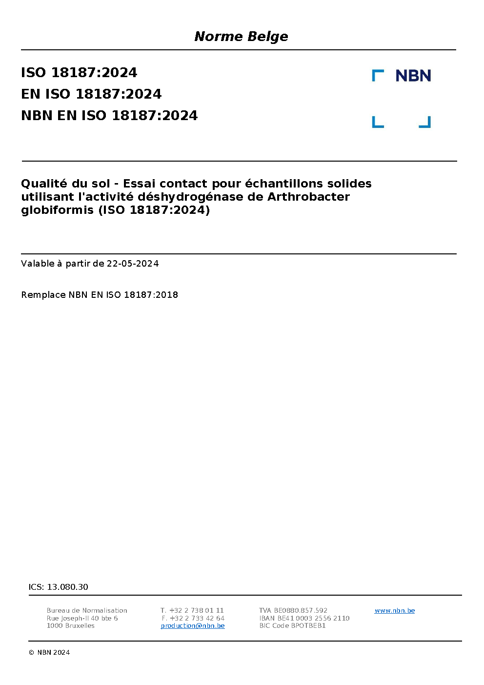 Soil quality - Contact test for solid samples using the dehydrogenase activity of Arthrobacter globiformis (ISO 18187:2016)