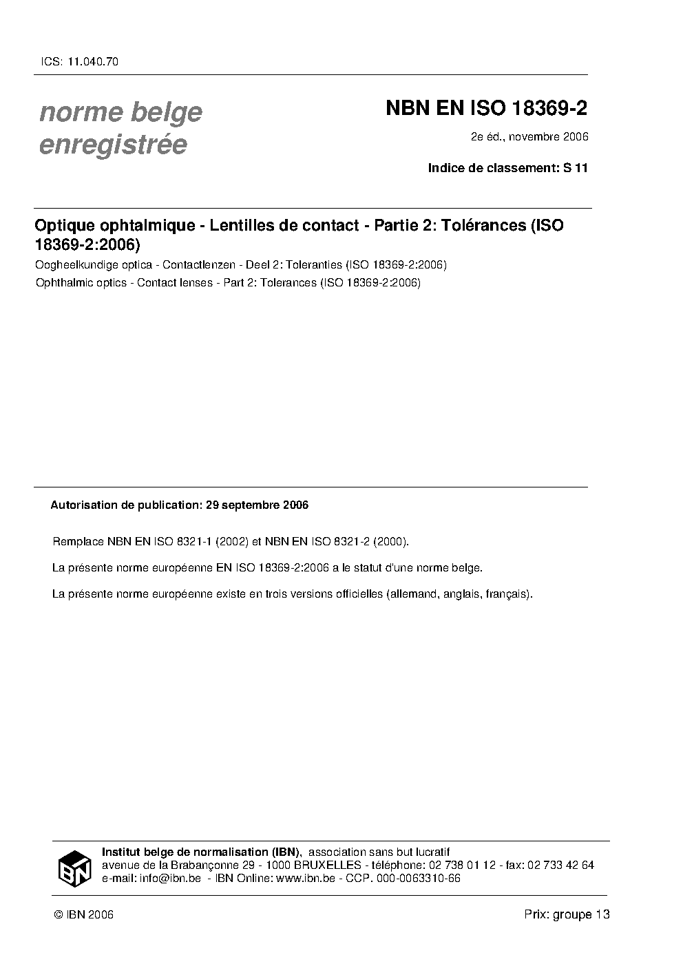 Ophthalmic optics - Contact lenses - Part 2: Tolerances (ISO 18369-2:2012)