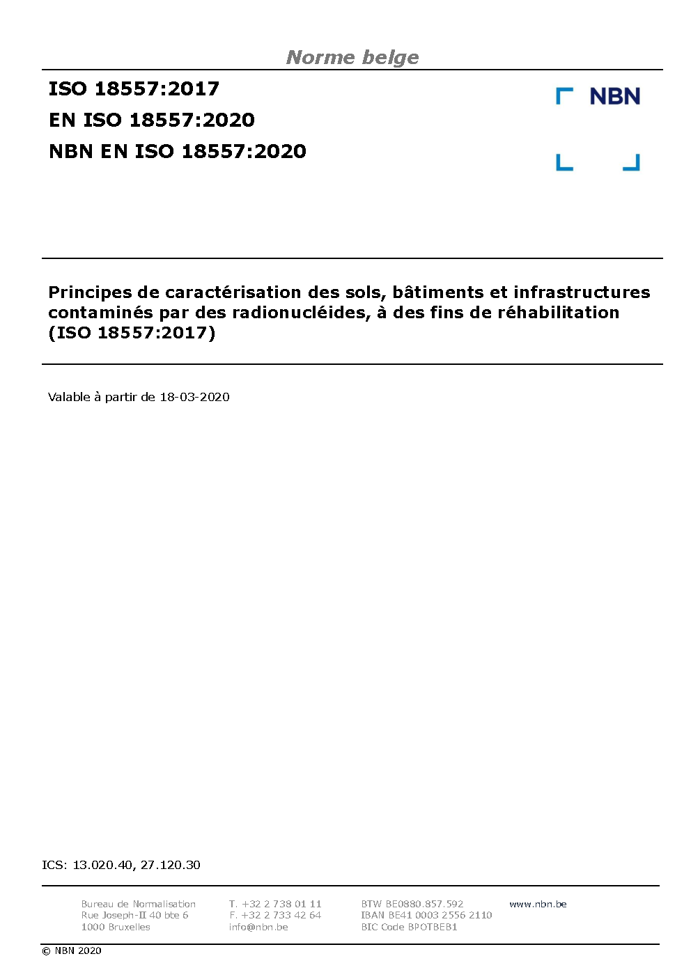 ISO 18557 presents guidelines for sampling strategies and characterization processes to assess the contamination of soils, buildings and infrastructures, prior to remediation and/or to check that the remediation objectives have been met (final release surveys). The principles presented need to be appropriately graded as regards the specific situations concerned (size, level of contamination?). It can be used in conjunction with each country's key documentation.