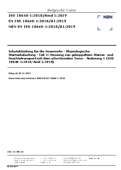 Protective clothing for firefighters - Physiological impact - Part 1: Measurement of coupled heat and moisture transfer with the sweating torso (ISO 18640-1:2018)