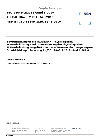 Protective clothing for firefighters - Physiological impact - Part 2: Determination of physiological heat load caused by protective clothing worn by firefighters - Amendment 1 (ISO 18640-2:2018/Amd 1:2019)