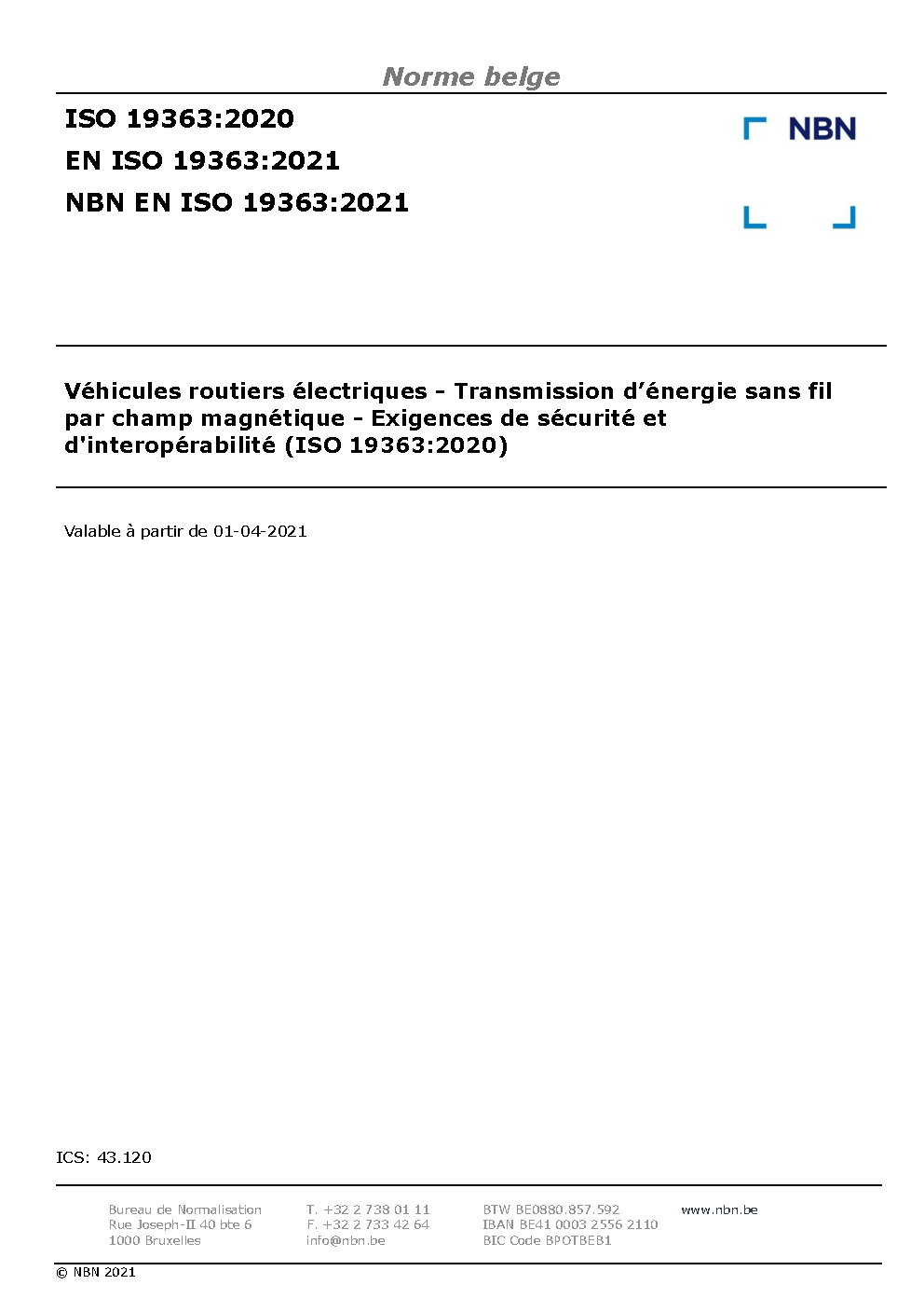 Electrically propelled road vehicles - Magnetic field wireless power transfer - Safety and interoperability requirements (ISO 19363:2020)