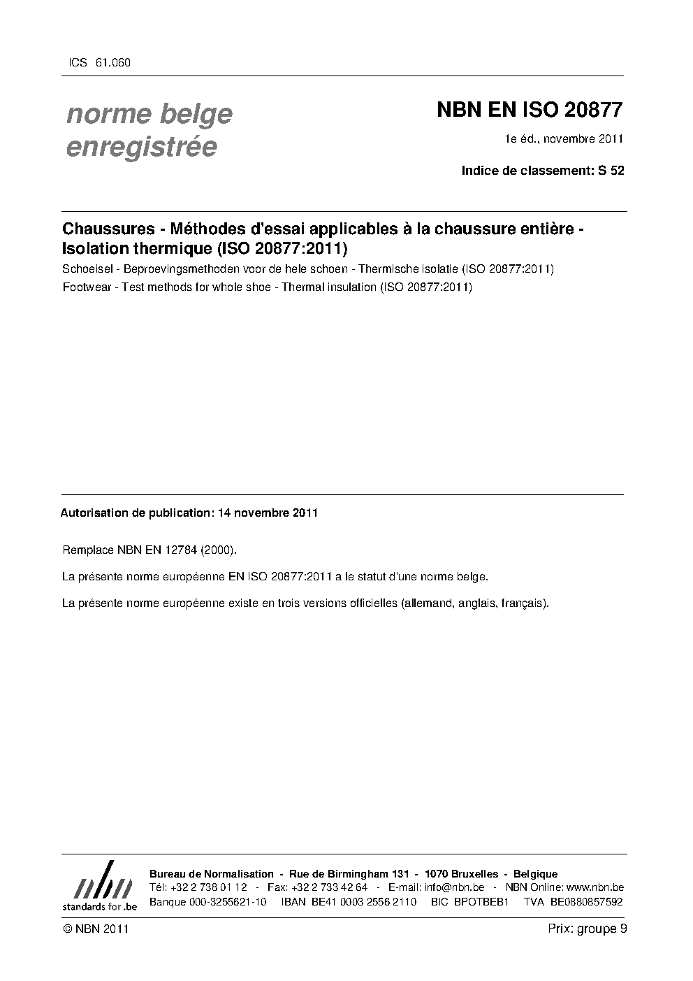 ISO 20877:2011 specifies a method for measuring insulation of footwear against heat or cold, in order to provide information for assessing footwear comfort.