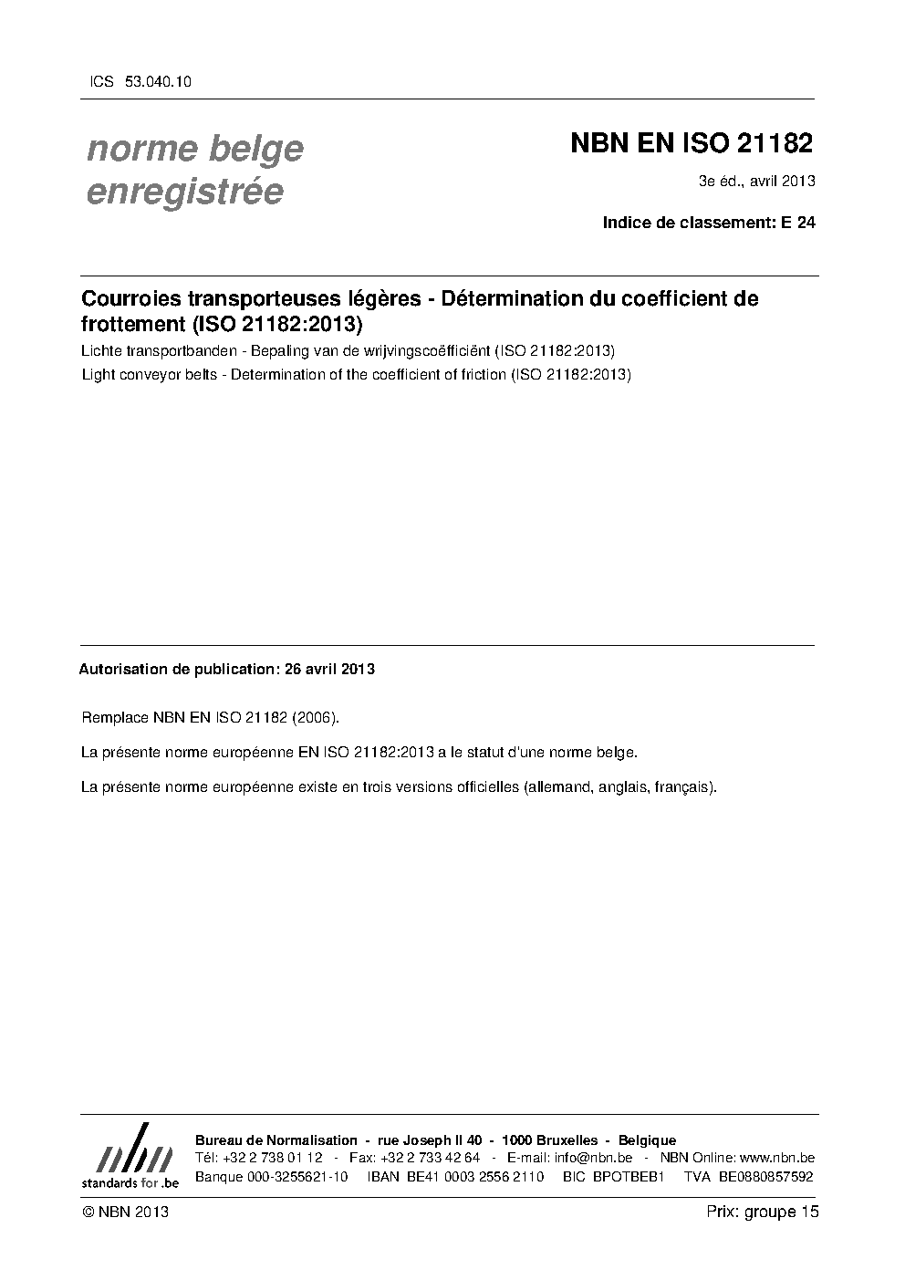 Light conveyor belts - Determination of the coefficient of friction (ISO 21182:2013)