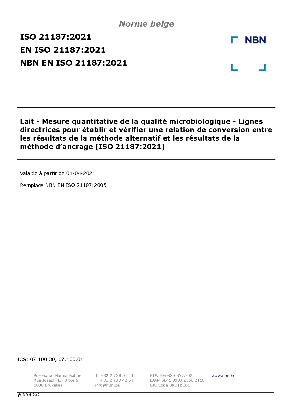 ISO 21187|IDF 196:2004 gives guidelines for the establishment of a conversion relationship between the results of a routine method and an anchor method, and its verification for the quantitative determination of the bacteriological quality of milk.