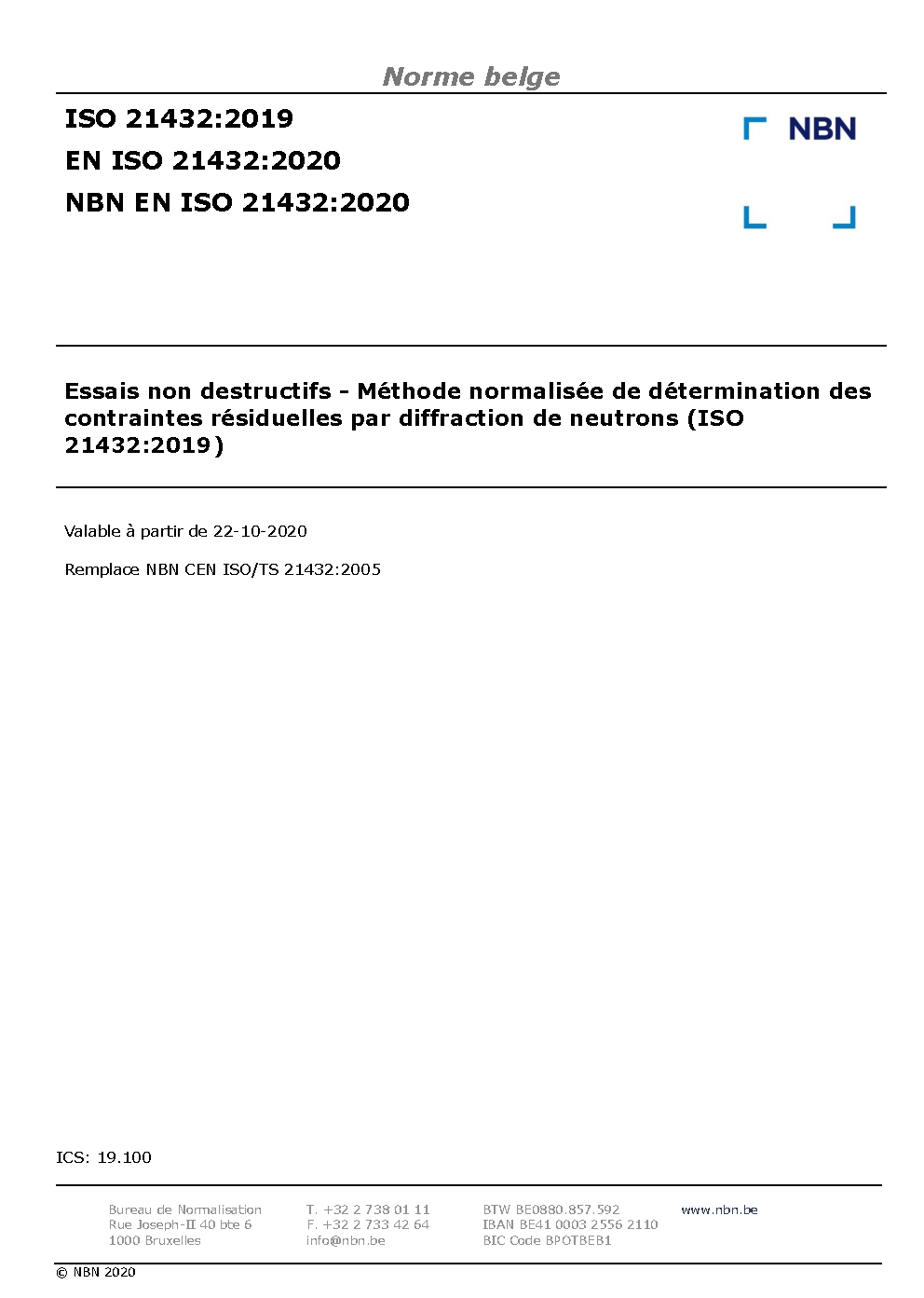 Non-destructive testing - Standard test method for determining residual stresses by neutron diffraction (ISO 21432:2019)