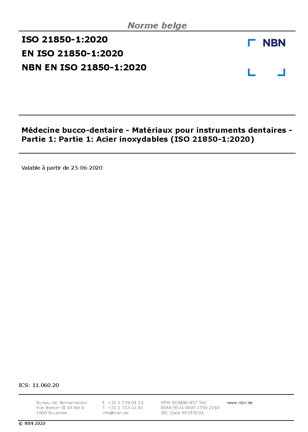 Dentistry - Materials for dental instruments - Part 1: Stainless steel (ISO 21850-1:2020)