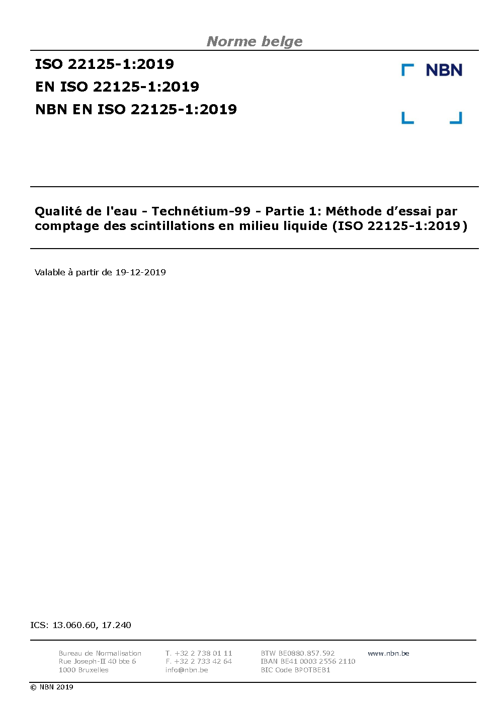 Water quality - Technetium-99 - Part 1: Test method using liquid scintillation counting (ISO 22125-1:2019)