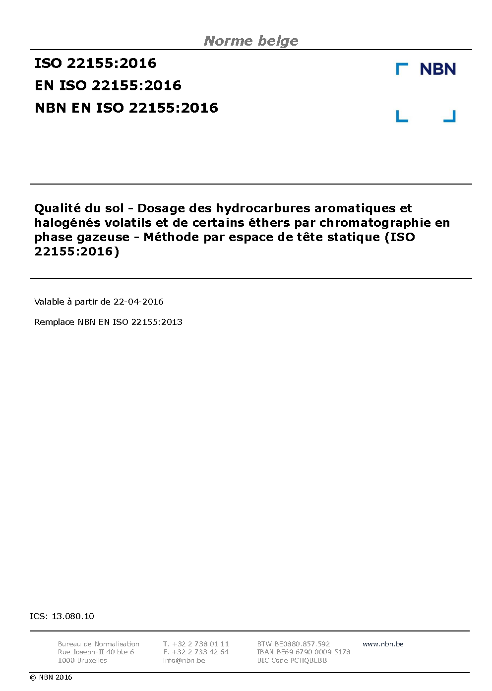 ISO 22155:2016 specifies a static headspace method for quantitative gas chromatographic determination of volatile aromatic and halogenated hydrocarbons and selected aliphatic ethers in soil.