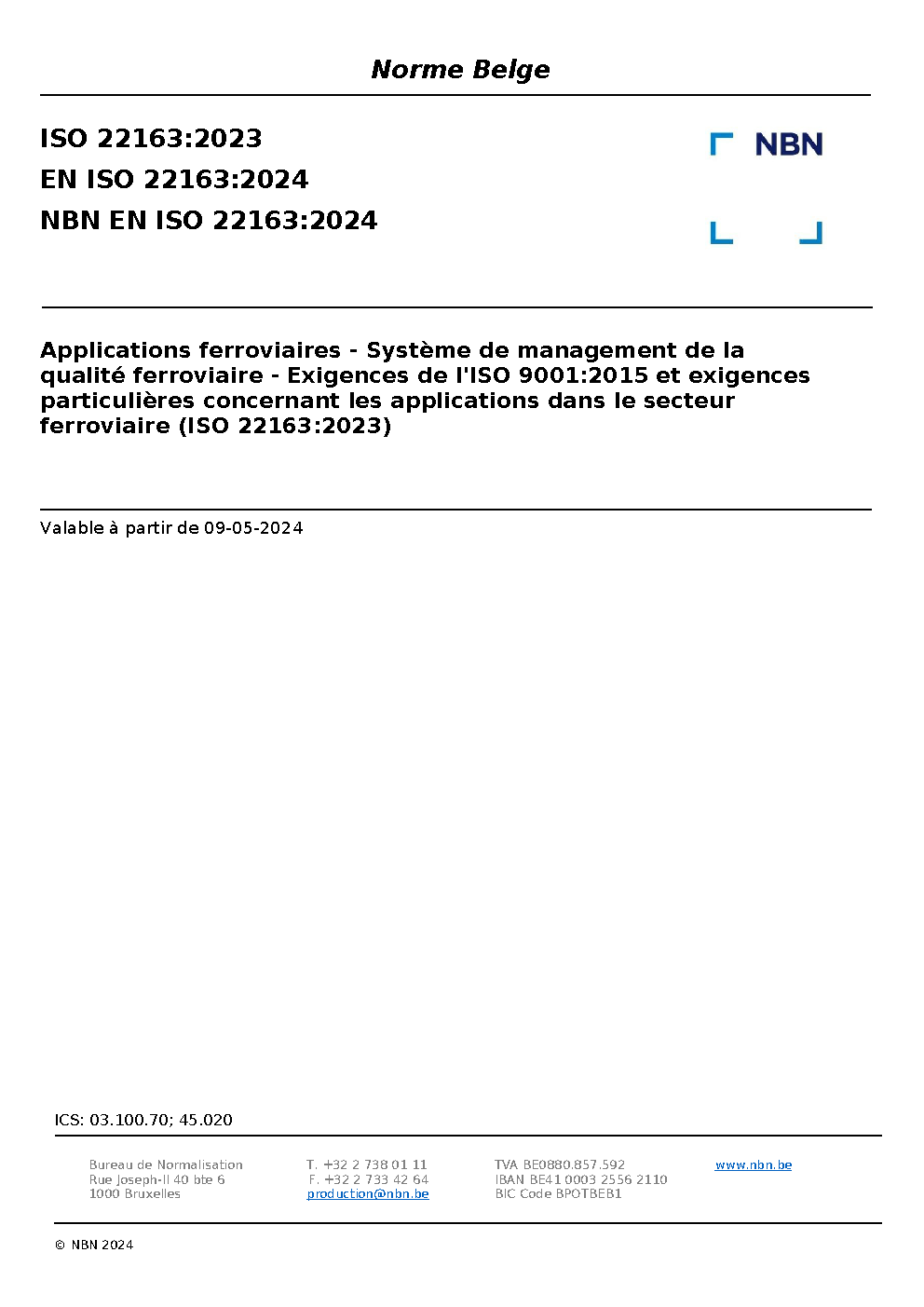 Railway applications - Railway quality management system - ISO 9001:2015 and specific requirements for application in the railway sector (ISO 22163:2023)