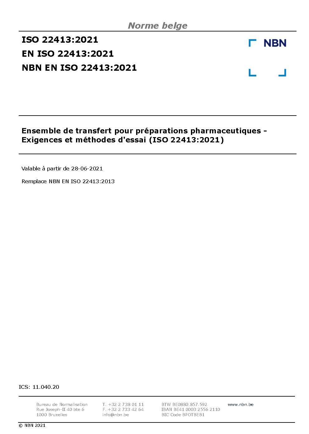 Transfer sets for pharmaceutical preparations - Requirements and test methods (ISO 22413:2010)