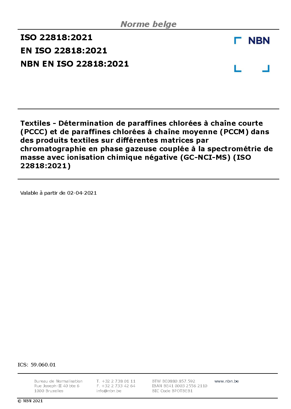 Textiles - Determination of short-chain chlorinated paraffins (SCCP) and middle-chain chlorinated paraffins (MCCP) in textile products out of different matrices by use of gas chromatography negative ion chemical ionization mass spectrometry (GC-NCI-MS) (ISO 22818:2021)