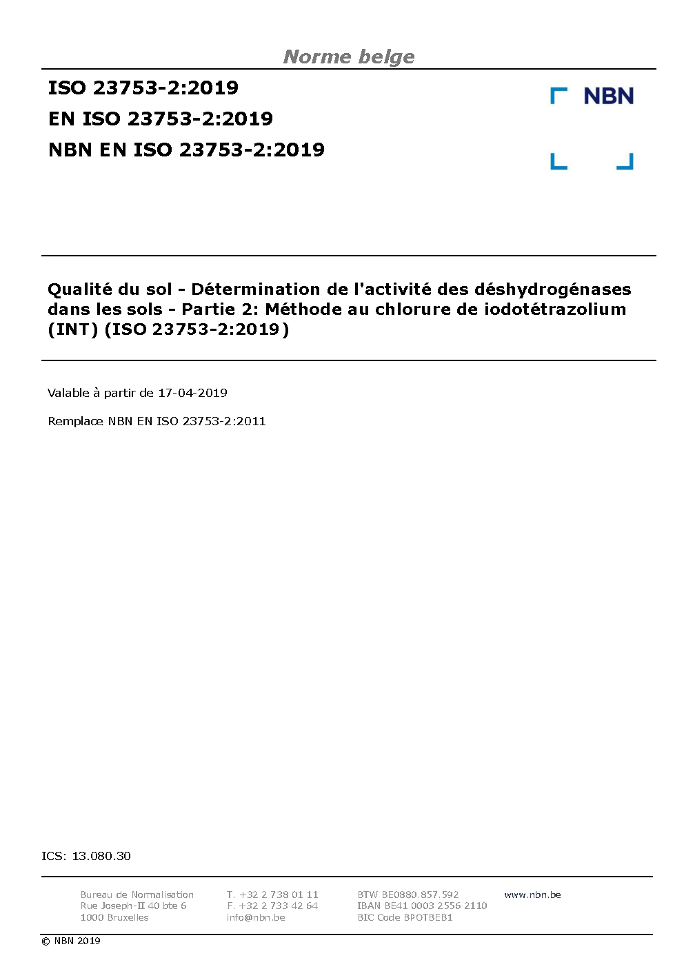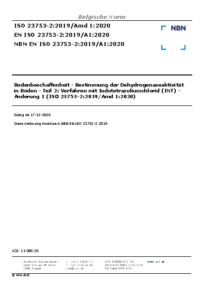 Soil quality - Determination of dehydrogenases activity in soils - Part 2: Method using iodotetrazolium chloride (INT) - Amendment 1 (ISO 23753-2:2019/Amd 1:2020)