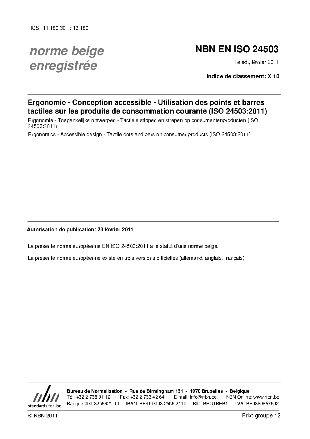 ISO 24503:2011 specifies requirements for the design of tactile dots and tactile bars for use on consumer products to improve accessibility for everyone, including older persons and persons with disabilities.