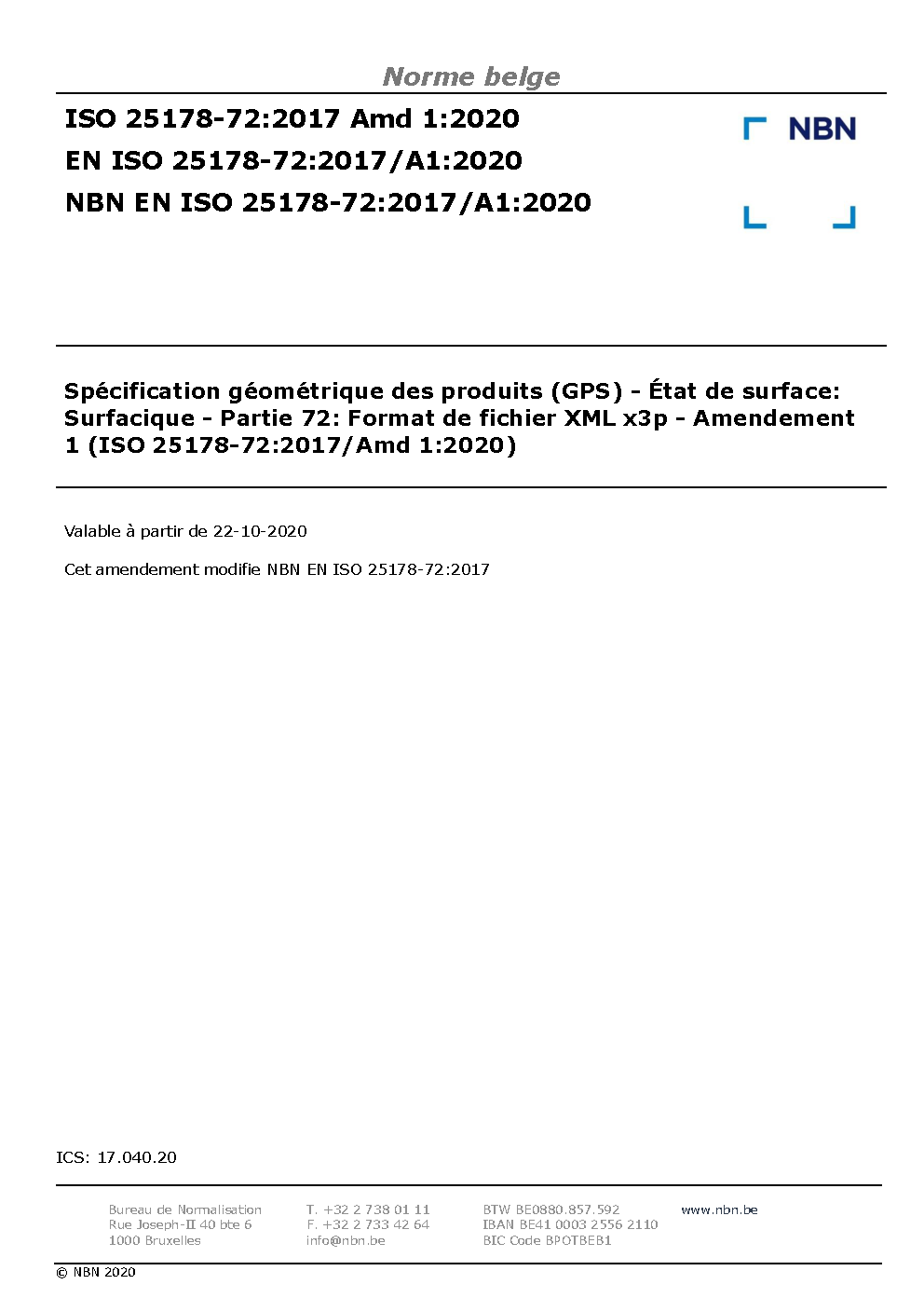 Geometrical product specifications (GPS) - Surface texture: Areal - Part 72: XML file format x3p - Amendment 1 (ISO 25178-72:2017/Amd 1:2020)