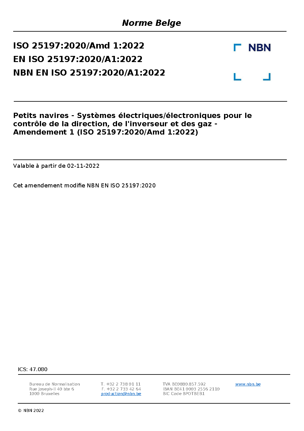 ISO 25197:2012 establishes the requirements for design, construction and testing of electrical/electronic steering, shift and throttle and dynamic position control systems, or combinations thereof, on small craft of up to 24 m length of hull.