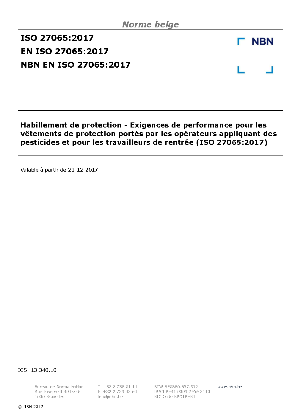 Protective clothing - Performance requirements for protective clothing worn by operators applying pesticides and for re-entry workers - Amendment 1: Surrogate test chemical (ISO 27065:2017/Amd 1:2019)