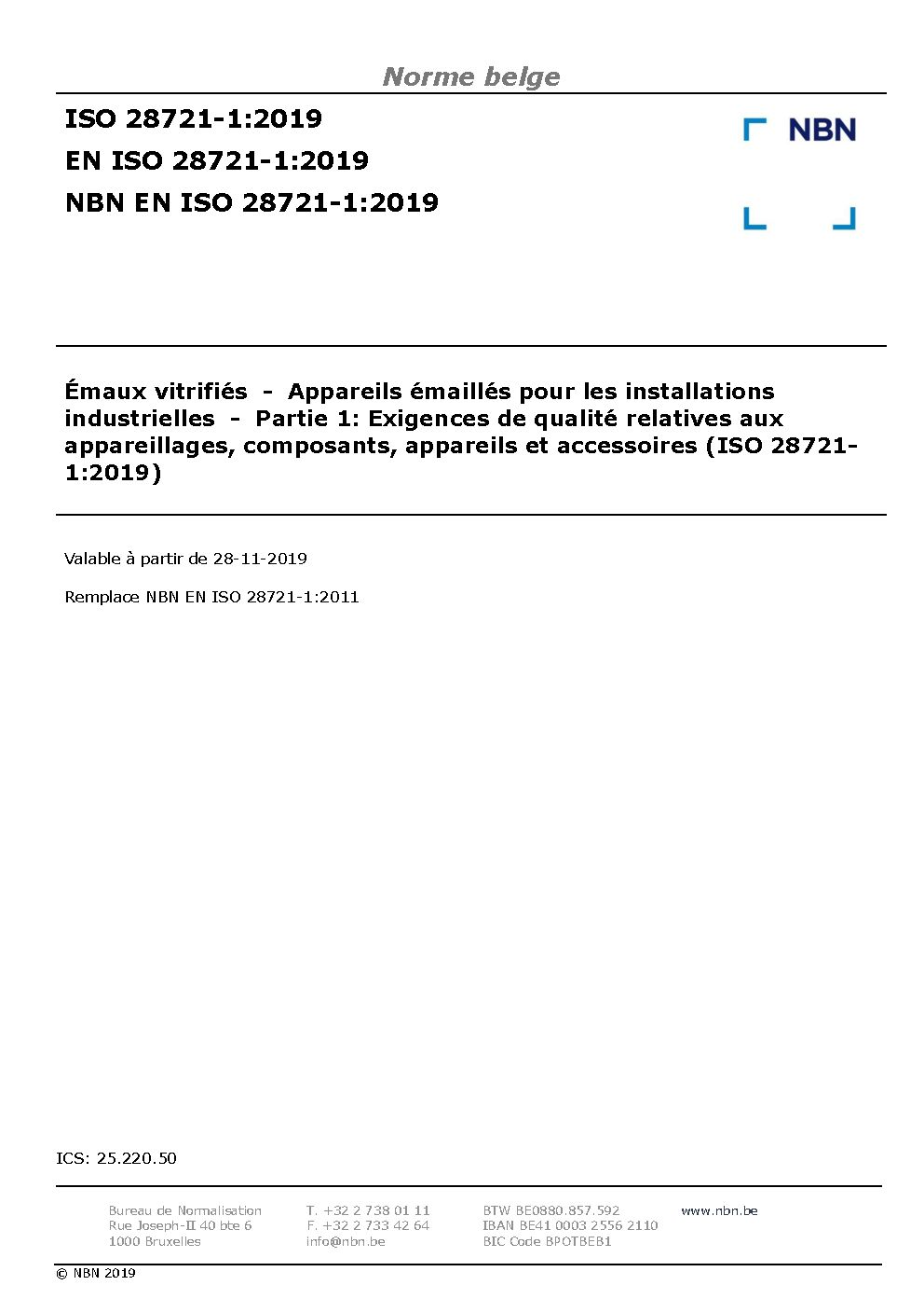 Vitreous and porcelain enamels - Glass-lined apparatus for process plants - Part 1: Quality requirements for apparatus, components, appliances and accessories (ISO 28721-1:2019)