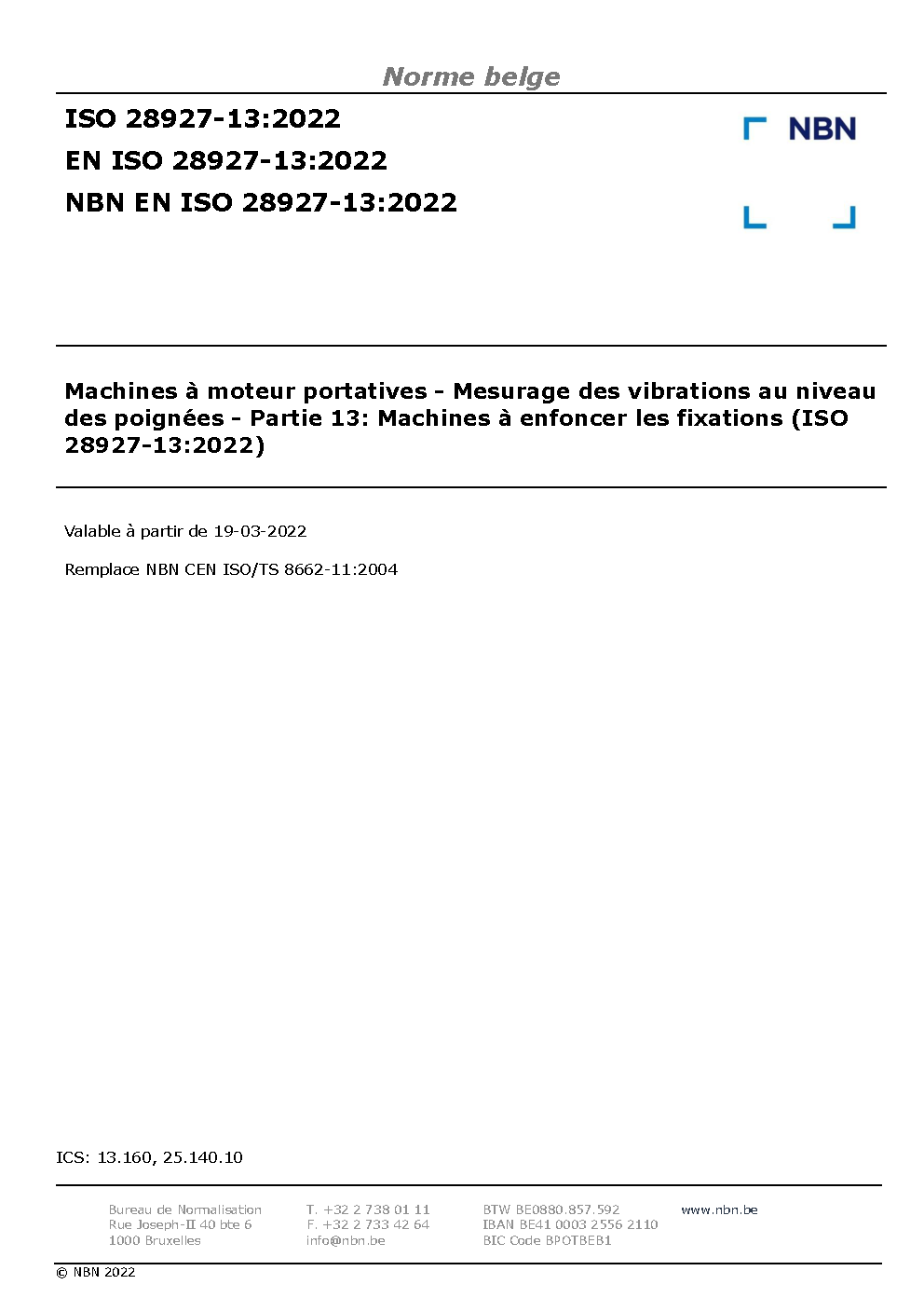 Hand-held portable power tools - Test methods for evaluation of vibration emission - Part 13: Fastener driving tools (ISO 28927-13:2022)