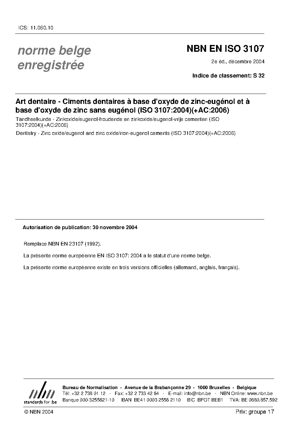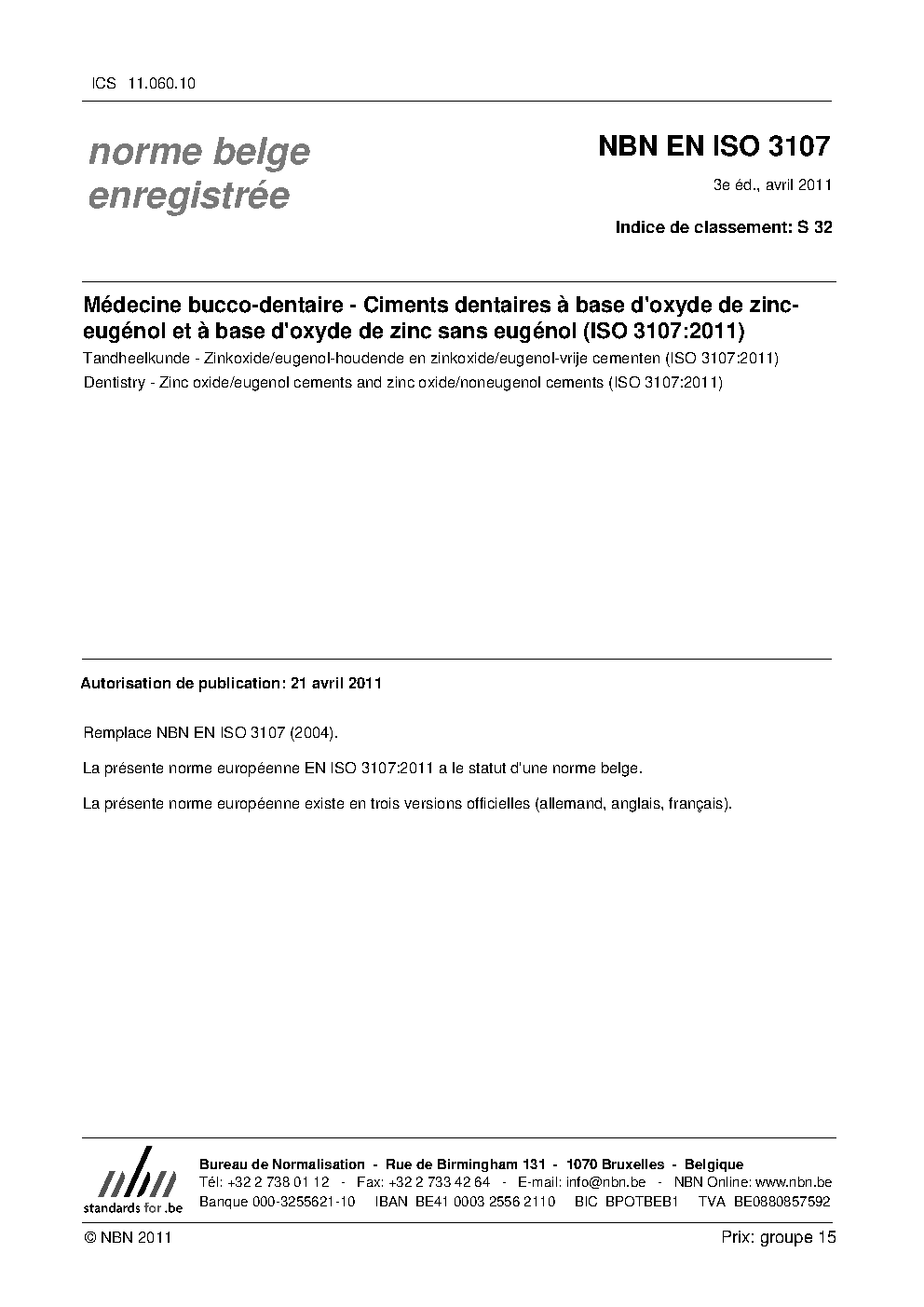 Dentistry - Zinc oxide/eugenol cements and zinc oxide/non-eugenol cements (ISO 3107:2011)