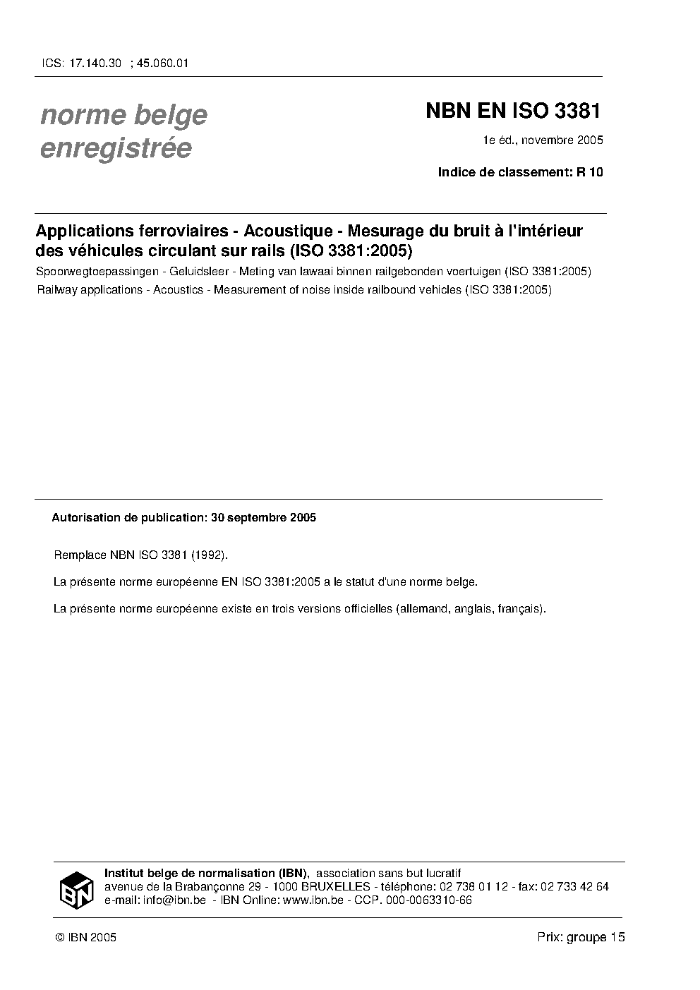 ISO 3381:2005 specifies the conditions for obtaining reproducible and comparable measurement results of levels and spectra of noise inside all kinds of vehicles on rails or other types of fixed track, except for track maintenance vehicles in operation.