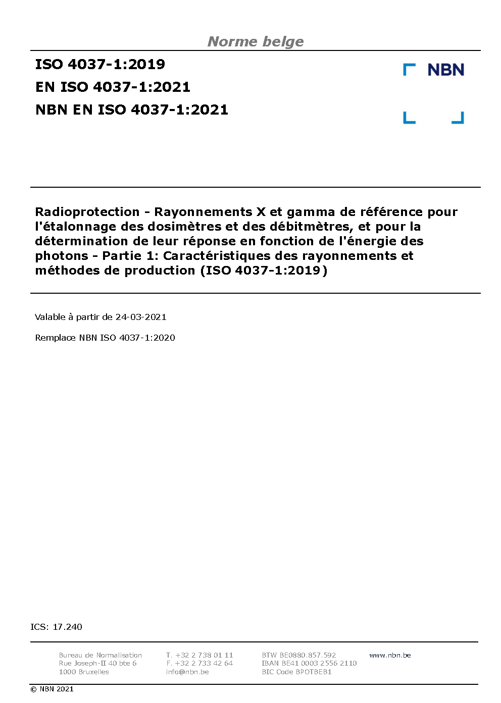 Radiological protection - X and gamma reference radiation for calibrating dosemeters and doserate meters and for determining their response as a function of photon energy - Part 1: Radiation characteristics and production methods (ISO 4037-1:2019)