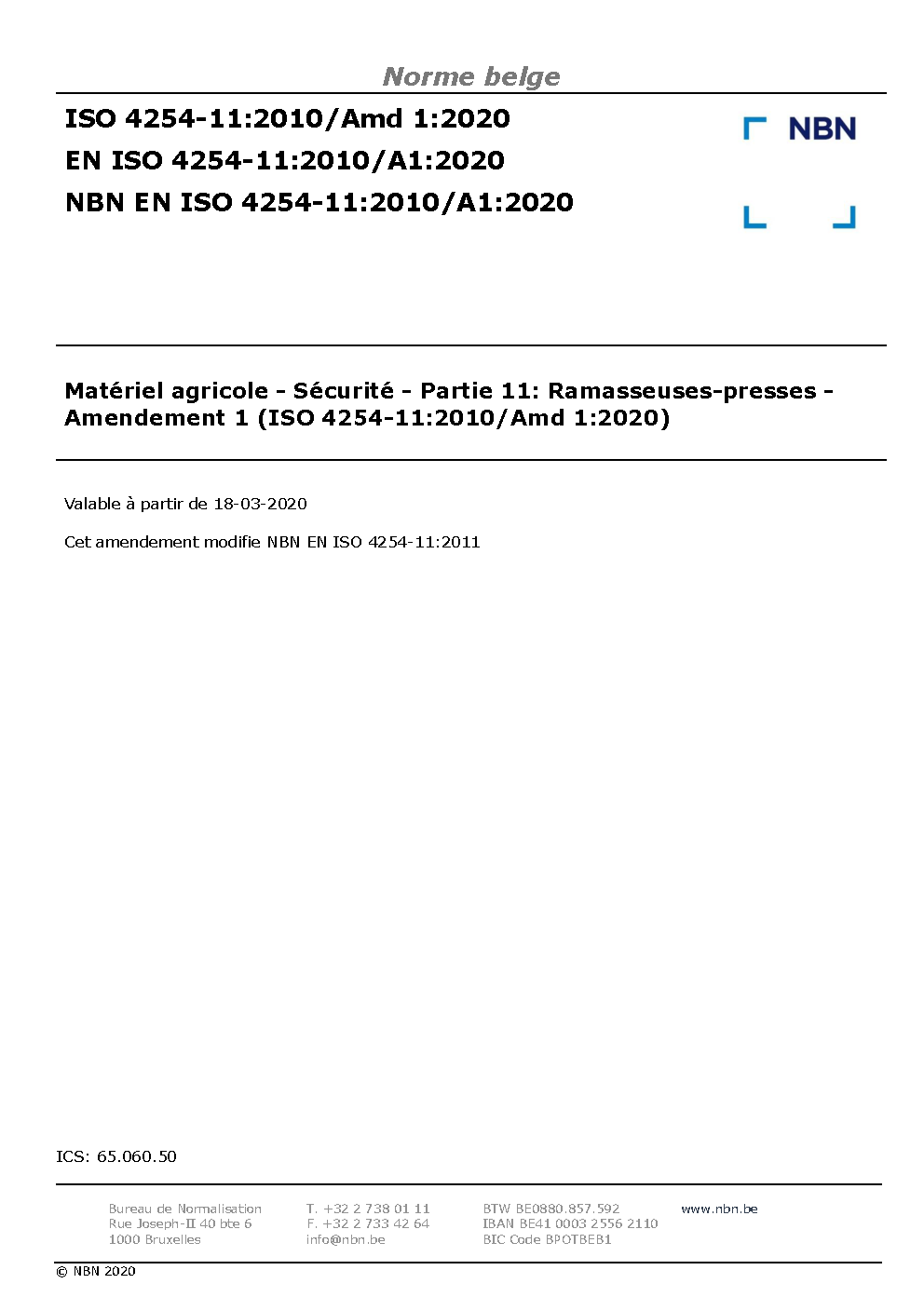 Agricultural machinery - Safety - Part 11: Pick-up balers - Amendment 1 (ISO 4254-11:2010/Amd 1:2020)