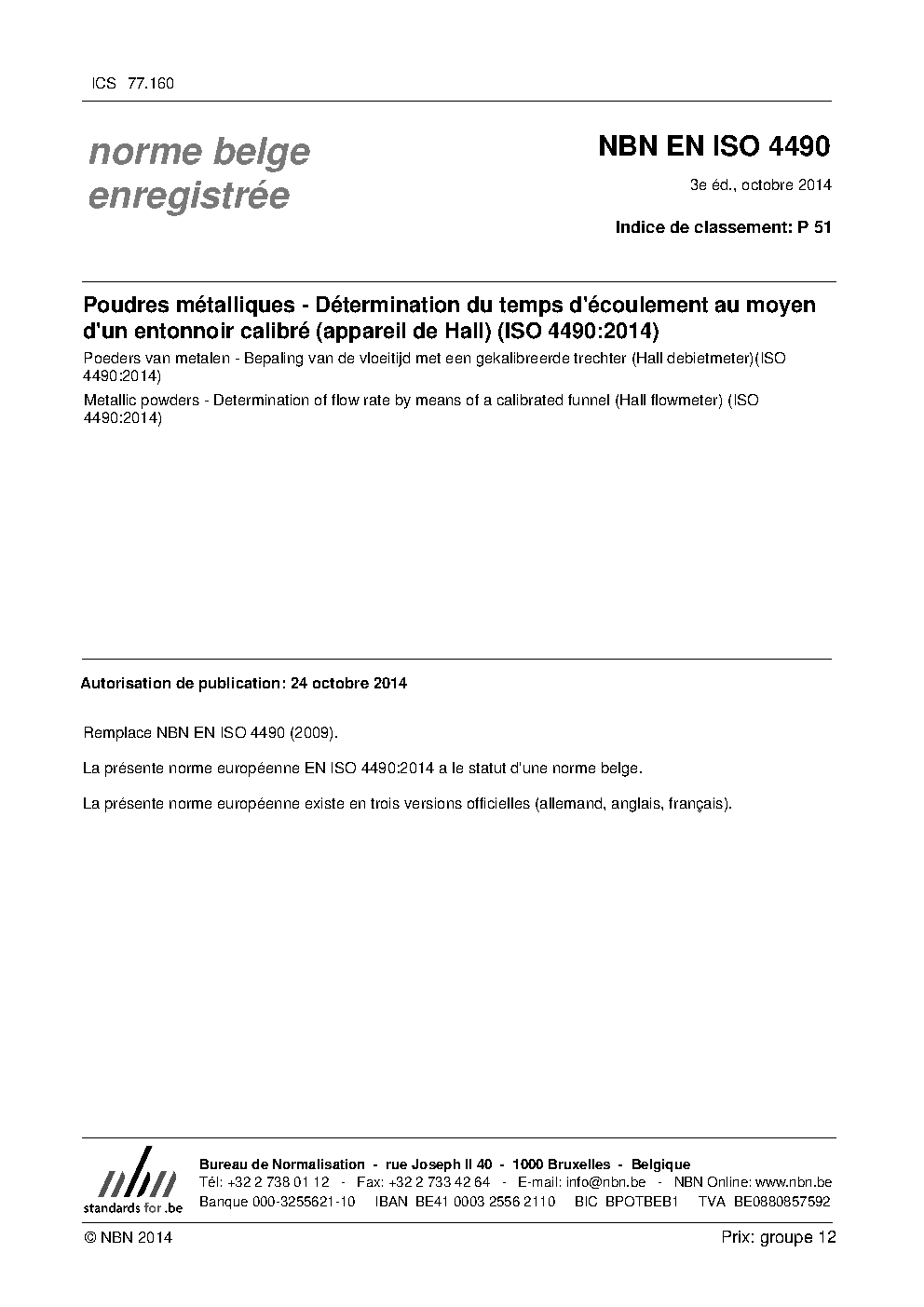 ISO 4490:2014 specifies a method for determining the flow rate of metallic powders, including powders for hard metals, by means of a calibrated funnel (Hall flowmeter). The method is applicable only to powders which flow freely through the specified test orifice.