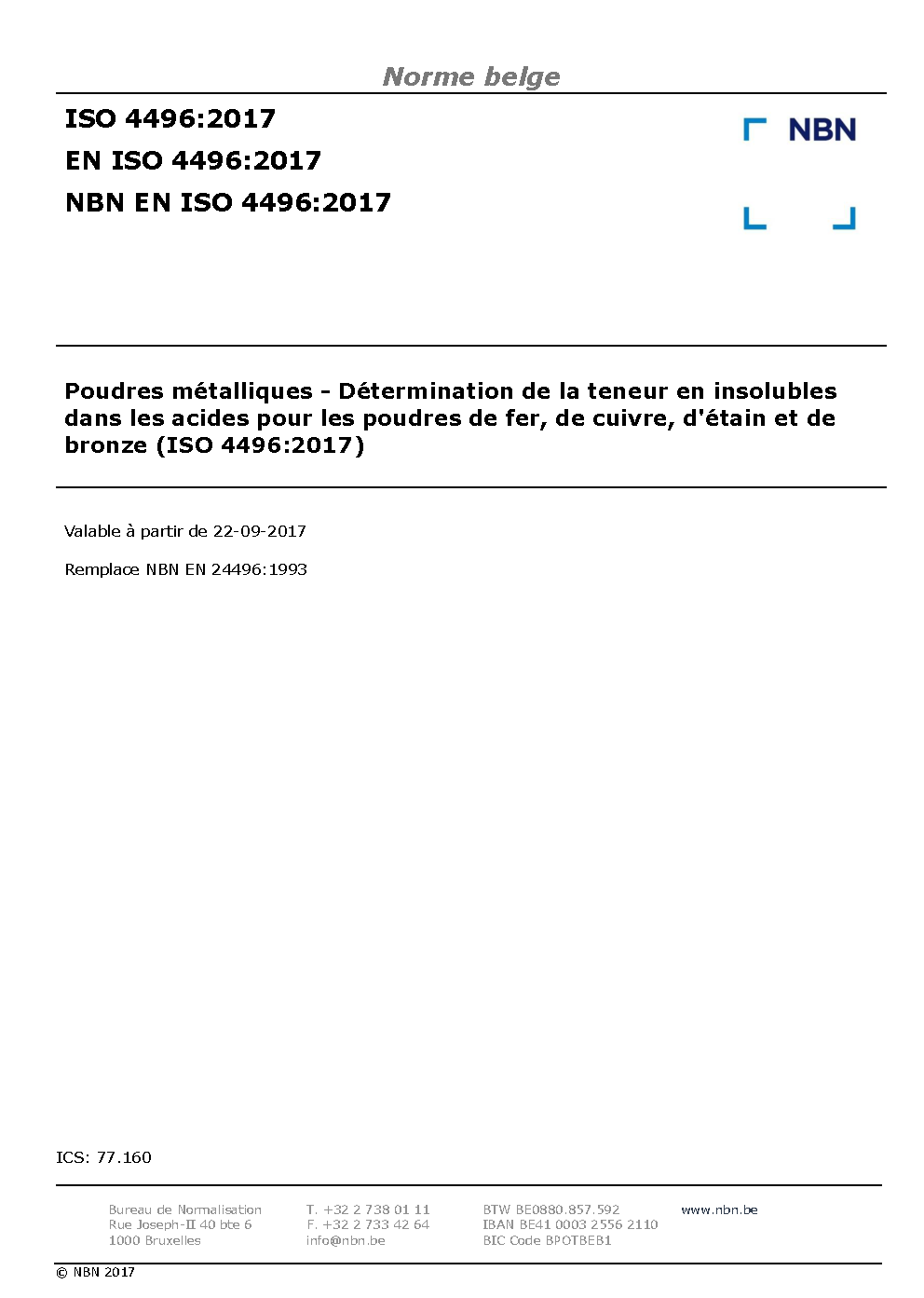 ISO 4496:2017 specifies methods for determining, in iron, copper, tin and bronze powders, the approximate content of non-metallic materials which are insoluble in the ordinary mineral acids.
