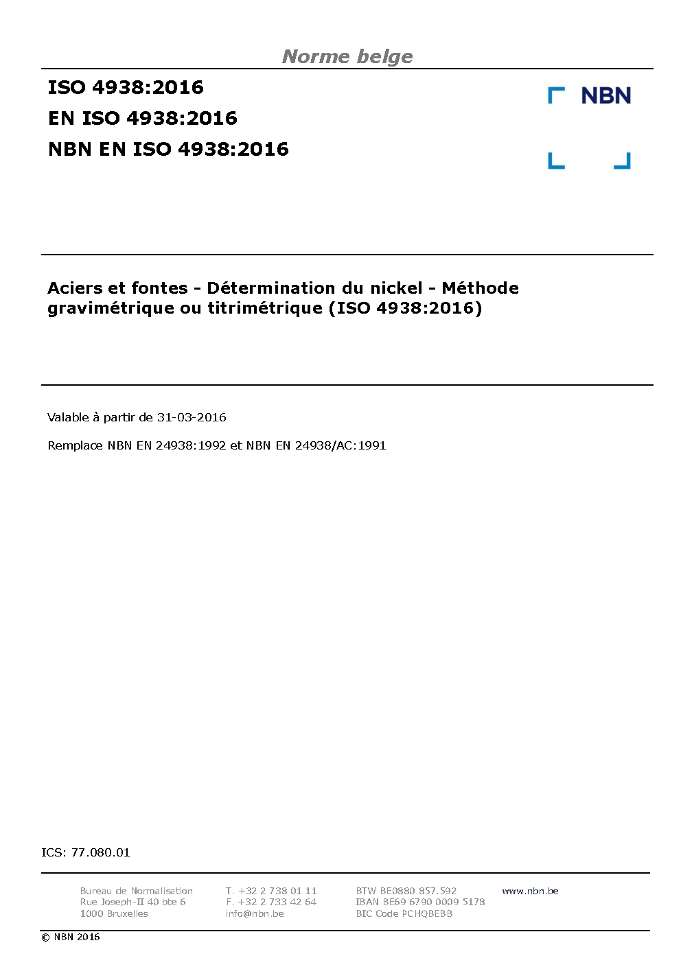 ISO 4938:2016 specifies a method for the determination of nickel in steel and iron by gravimetry or titrimetry.