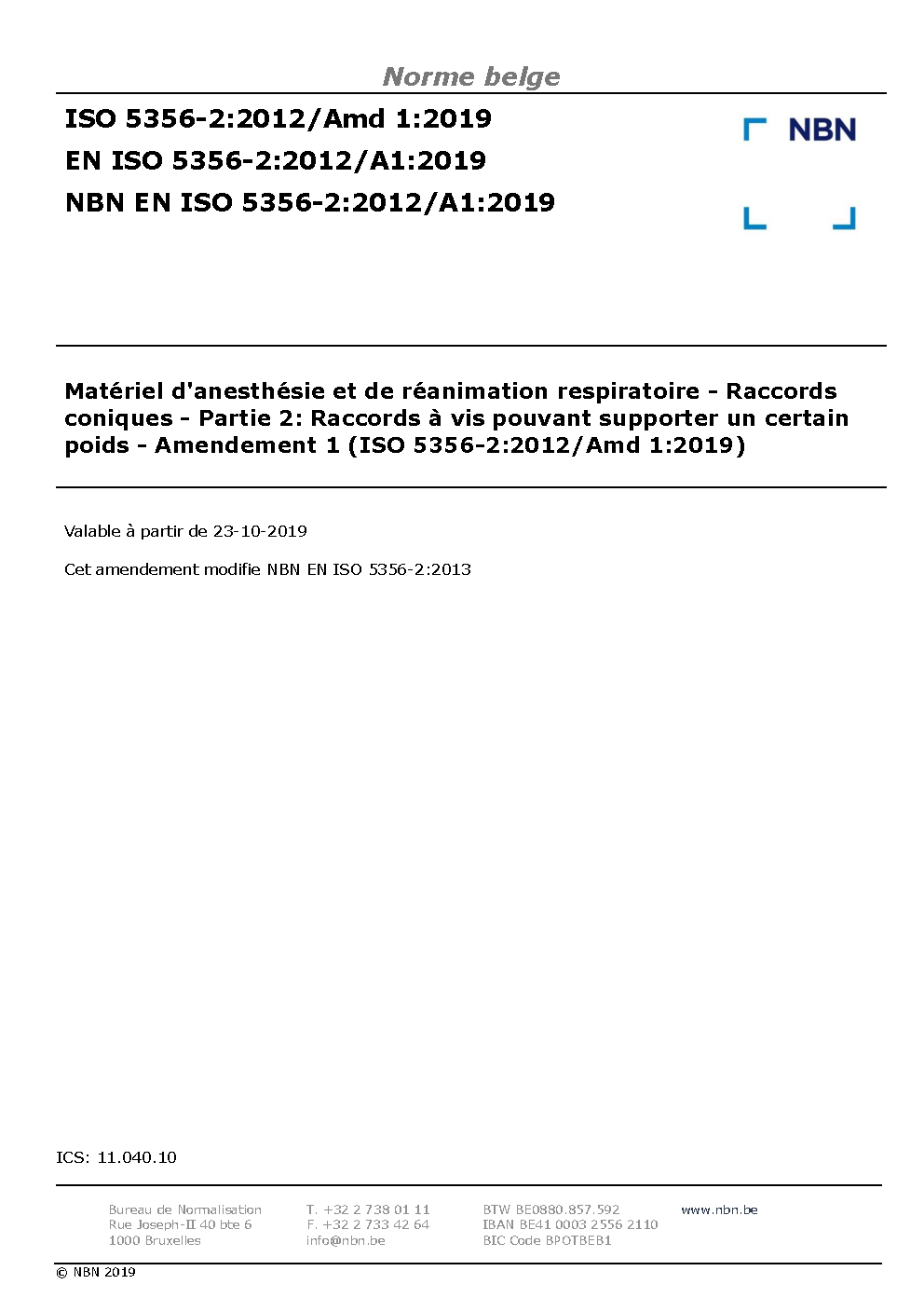 Anaesthetic and respiratory equipment - Conical connectors - Part 2: Screw-threaded weight-bearing connectors - Amendment 1 (ISO 5356-2:2012/Amd 1:2019)