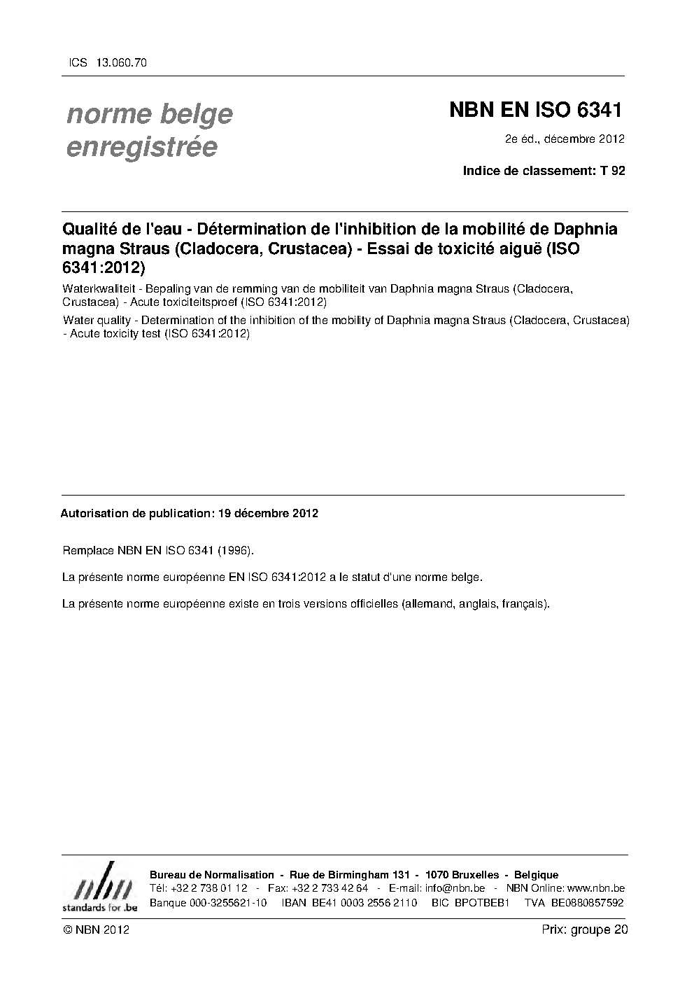 Water quality - Determination of the inhibition of the mobility of Daphnia magna Straus (Cladocera, Crustacea) - Acute toxicity test (ISO 6341:1996)
