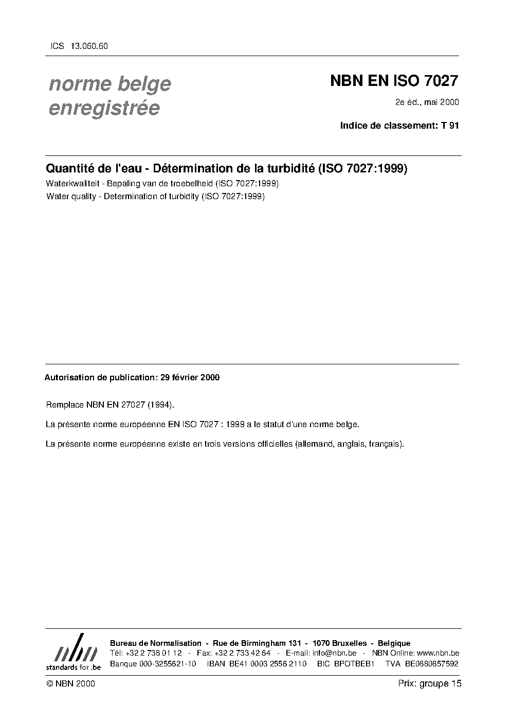 NBN EN ISO 7027:2000