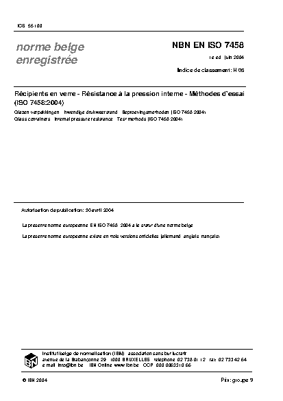 Glass containers - Internal pressure resistance - Test methods (ISO/FDIS 7458:2004)