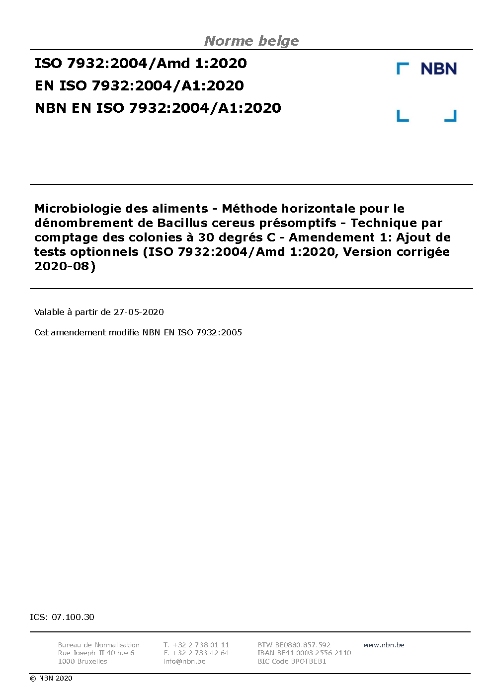 Microbiology of food and animal feeding stuffs - Horizontal method for the enumeration of presumptive Bacillus cereus - Colony-count technique at 30 degrees C - Amendment 1: Inclusion of optional tests (ISO 7932:2004/Amd 1:2020, Corrected version 2020-08)