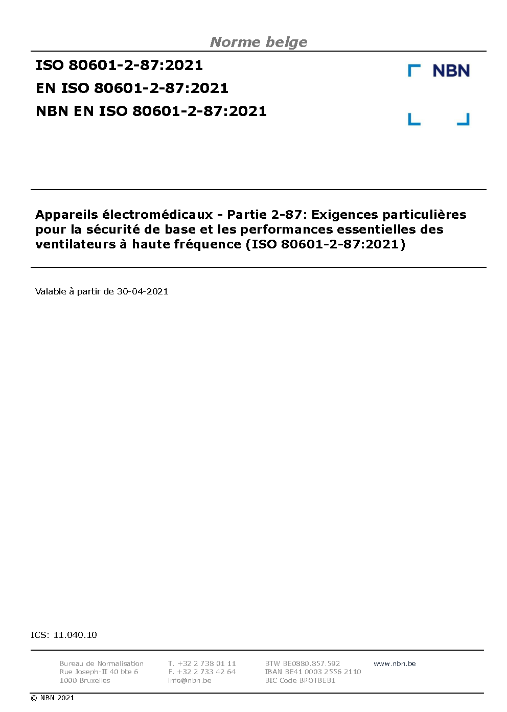 Medical electrical equipment - Part 2-87: Particular requirements for basic safety and essential performance of high-frequency ventilators (ISO 80601-2-87:2021)