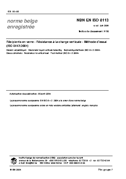 ISO 8113:2004 specifies a method for determination of the resistance of glass containers to external force in the direction of the vertical axis.