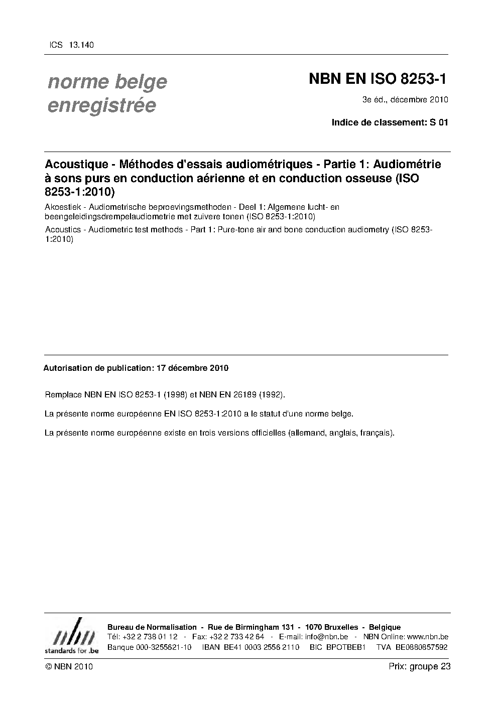 Acoustics - Audiometric test methods - Part 1: Pure-tone air and bone conduction audiometry (ISO 8253-1:2010)