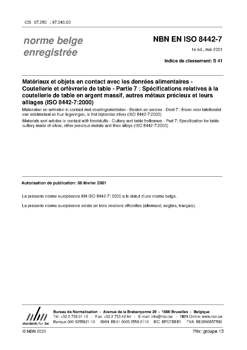 Materials and articles in contact with foodstuffs - Cutlery and table holloware - Part 7: Specification for table cutlery made of silver, other precious metals and their alloys (ISO 8442-7:2000)