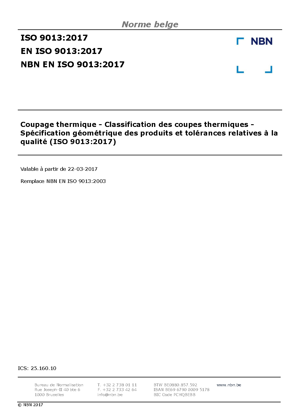 International Standard ISO 9013 applies to materials suitable for oxyfuel flame cutting, plasma cutting and laser cutting. It is applicable to flame cuts from 3 mm to 300 mm, plasma cuts from 1 mm to 150 mm and to laser cuts from 0,5 mm to 40 mm. This International Standard includes geometrical product specifications and quality tolerances.