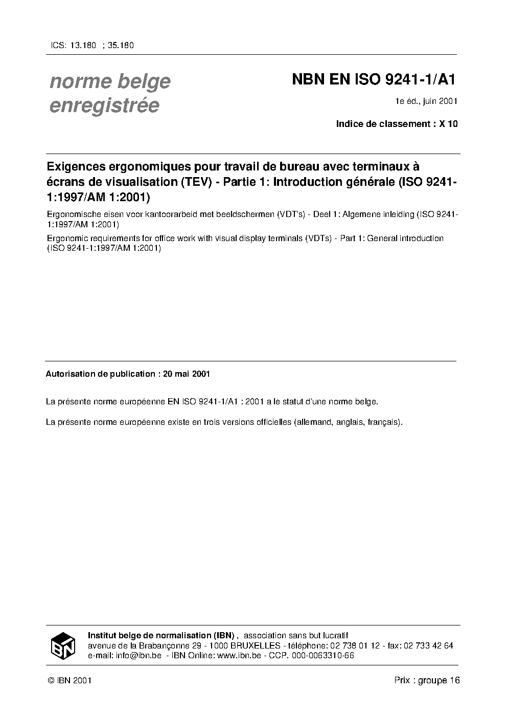 Ergonomic requirements for office work with visual display terminals (VDTs) - Part 1: General introduction (ISO 9241-1:1997/AM 1:2001)