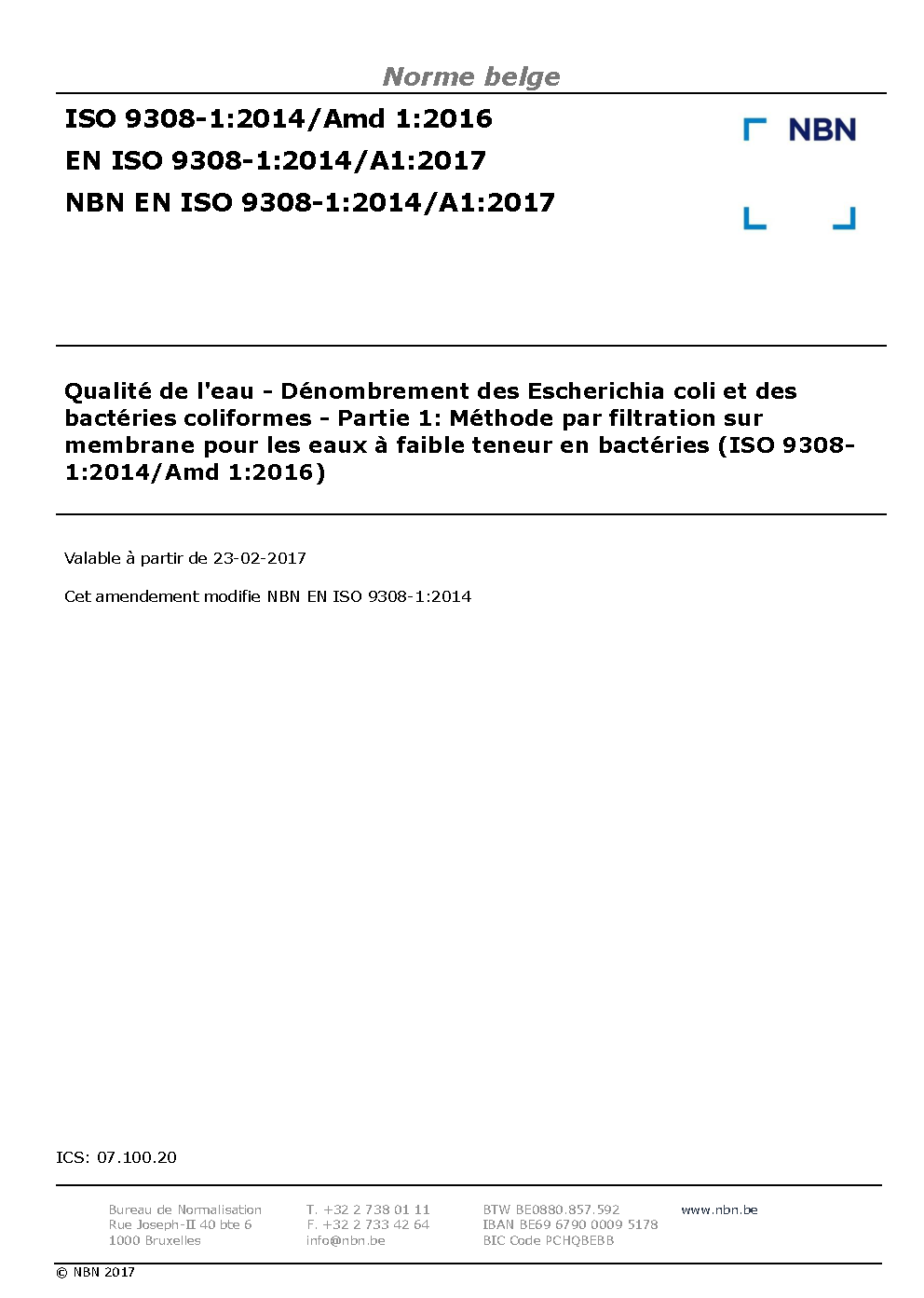 Water quality - Enumeration of Escherichia coli and coliform bacteria - Part 1: Membrane filtration method for waters with low bacterial background flora (ISO 9308-1:2014/Amd 1:2016)
