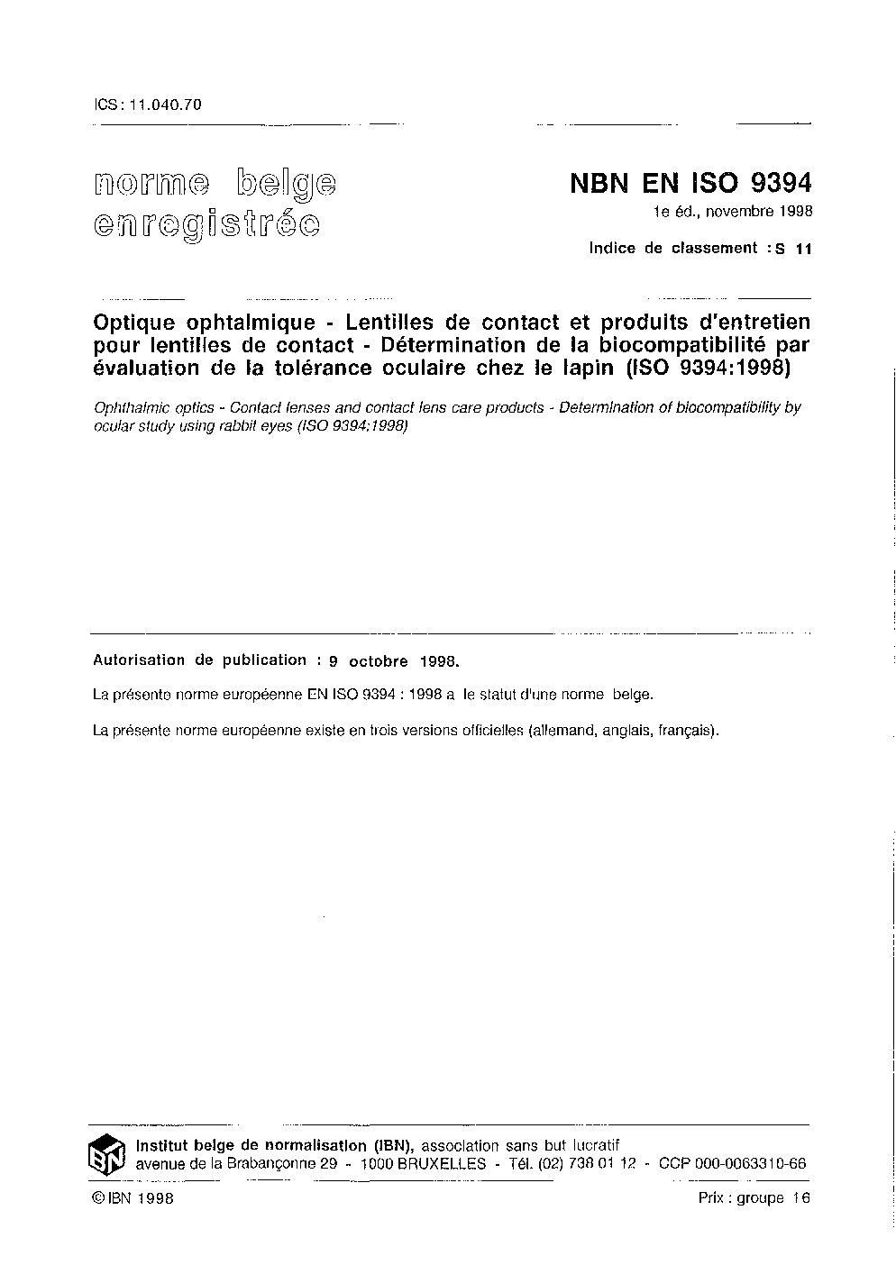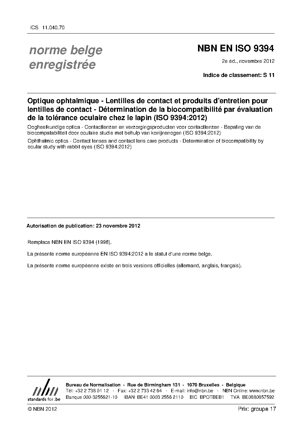 Ophthalmic optics - Contact lenses and contact lens care products - Determination of biocompatibility by ocular study with rabbit eyes (ISO 9394:2012)