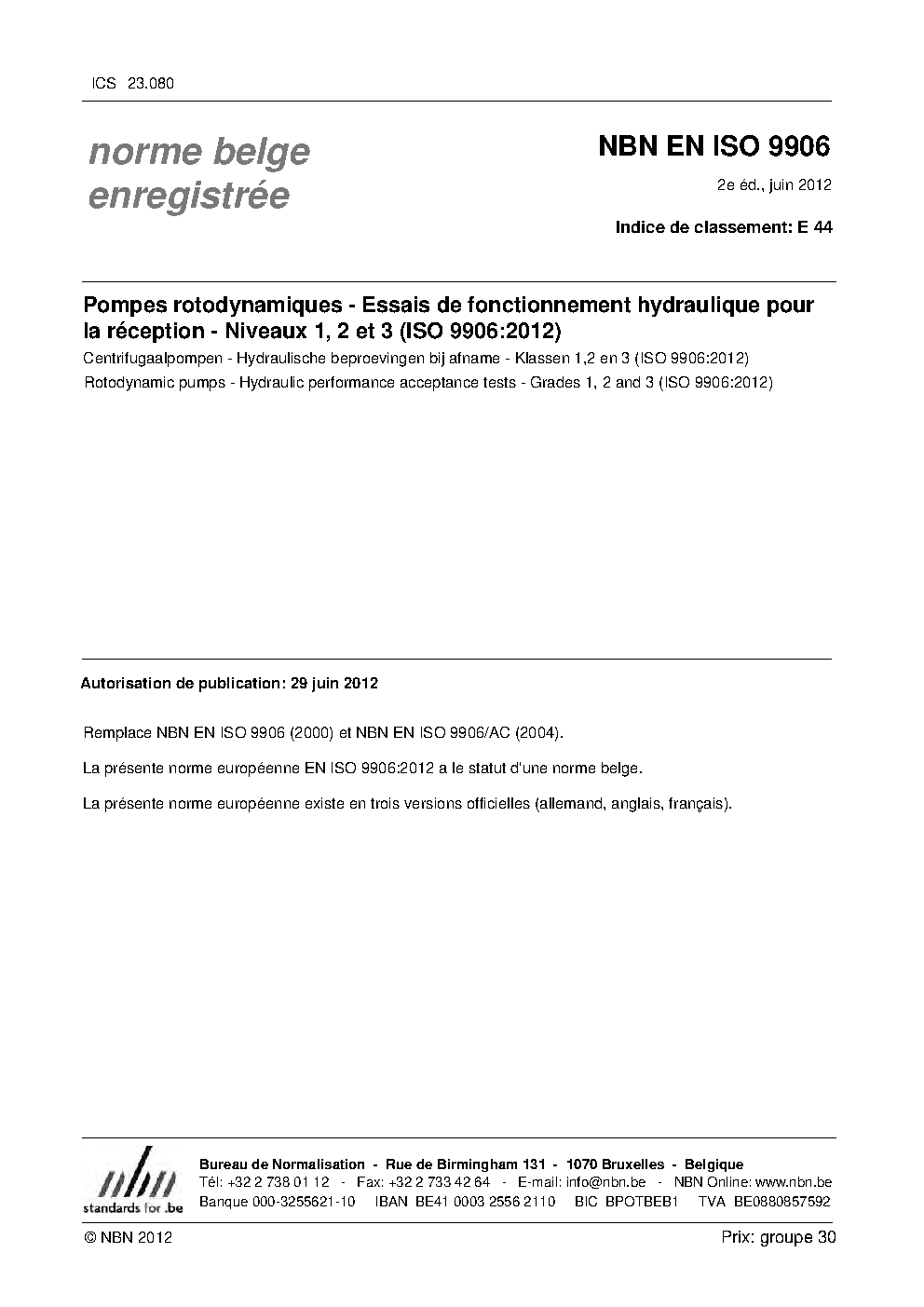 ISO 9906:2012 specifies hydraulic performance tests for customers' acceptance of rotodynamic pumps (centrifugal, mixed flow and axial pumps). It is intended to be used for pump acceptance testing at pump test facilities, such as manufacturers' pump test facilities or laboratories. ISO 9906:2012 can be applied to pumps of any size and to any pumped liquids which behave as clean, cold water.