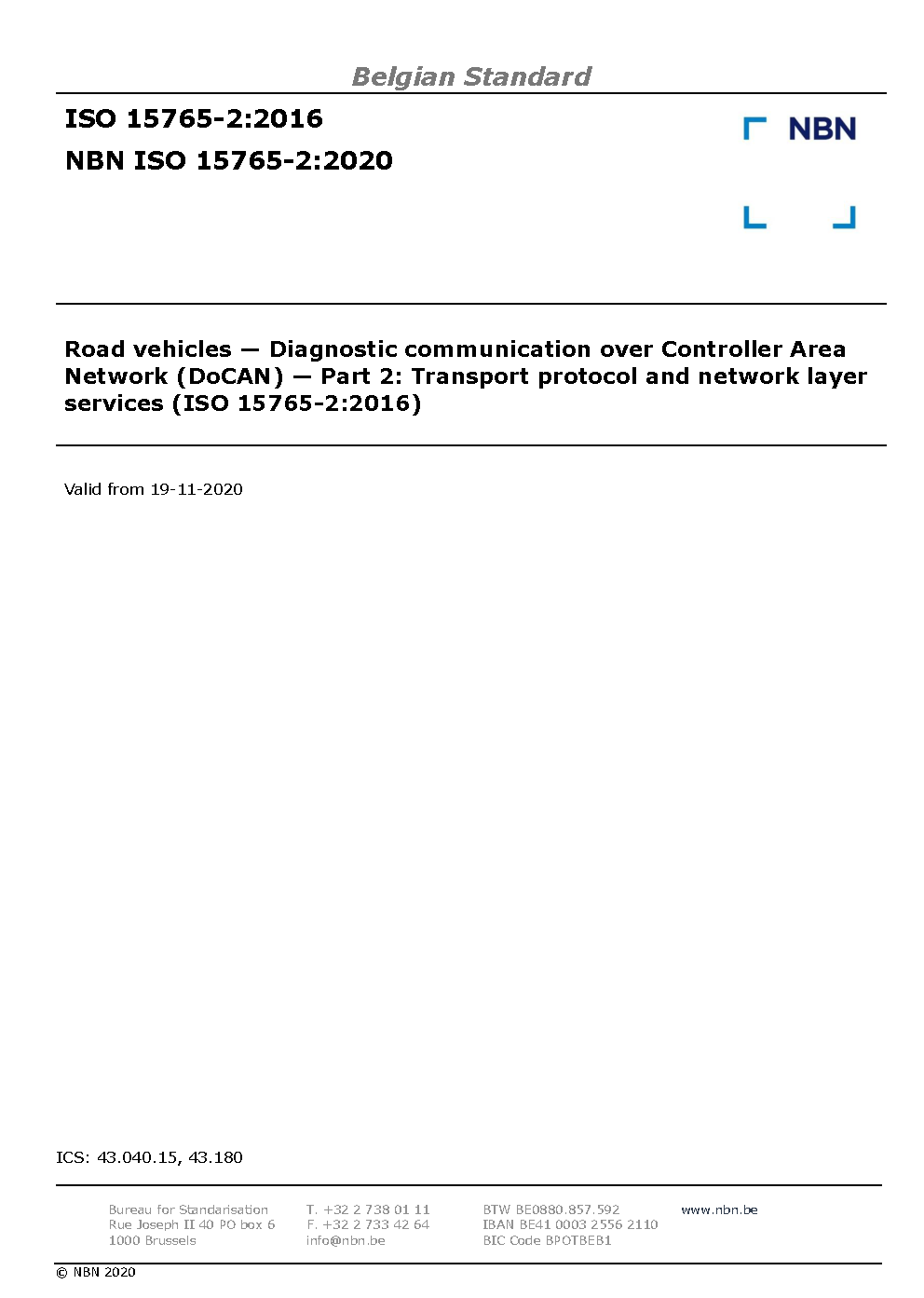 This part of ISO 15765 specifies a transport protocol and network layer services tailored to meet the requirements of CAN-based vehicle network systems on controller area networks as specified in ISO 11898-1. It has been defined in accordance with the diagnostic services established in ISO 14229-1 and ISO 15031-5 but is not limited to use with them and is also compatible with most other communication needs for in-vehicle networks.