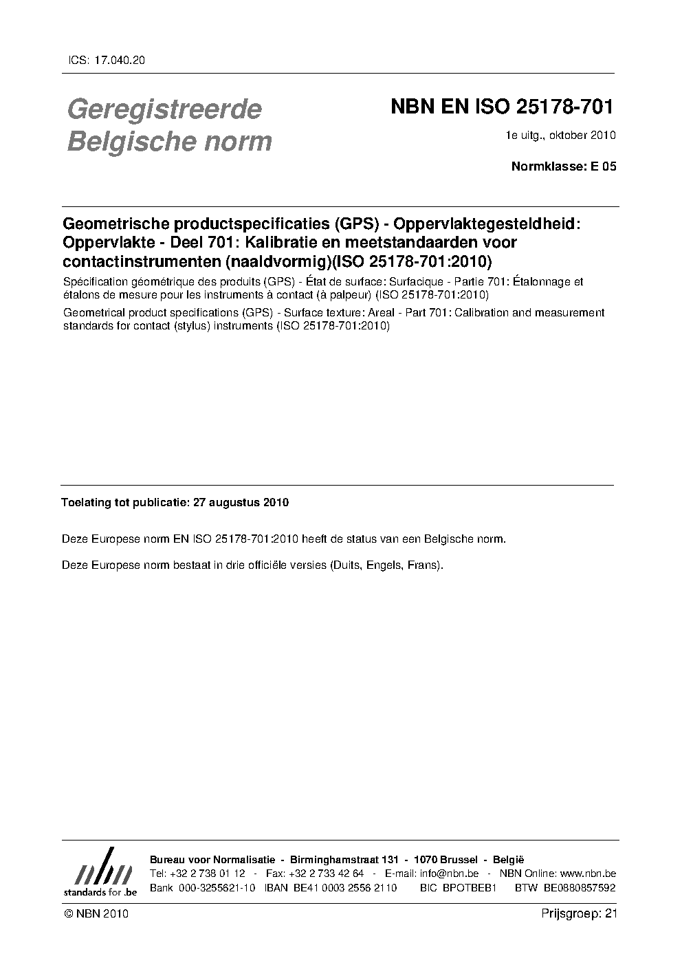 | Publisher | Bureau de Normalisation Belge (NBN) |