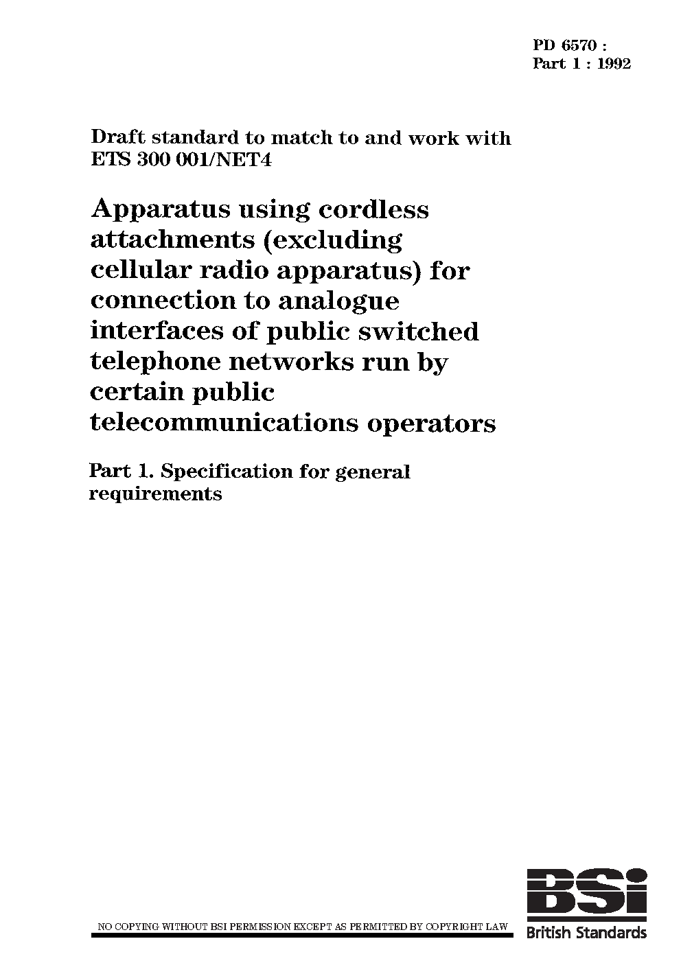 Draft standard to match and work with ETS 300 001/NET4 "Apparatus using cordless attachments (excluding cellular radio apparatus) for connection analogue interfaces of public switched telephone networks run by certain telecommunications operators" Specification general requirements