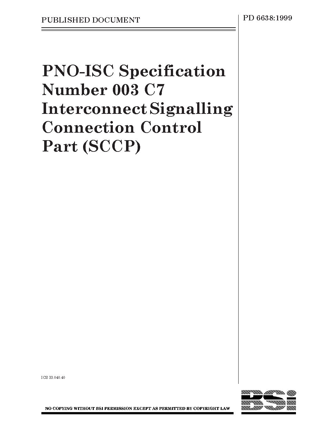PNO-ISC specification number 003. C7 interconnect signalling connection control part (SCCP)